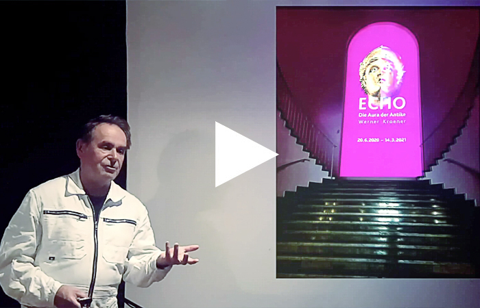 Der mediale Parcours als Erlebnis-Spaziergang führt durch 7 Räume mit 7 zentralen Themen des antiken Denkens, die relevant für unseren modernen Zeitgeist erscheinen.