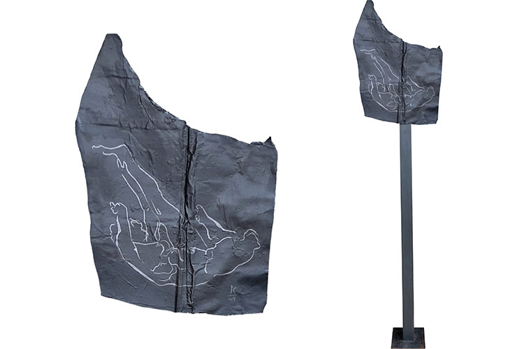 "Spiel & Tod", (röm. Faustkämpfer) (2m x 3m) mit 2 flankierenden schwarzen Malerei-Tafeln auf Stahlsäulen