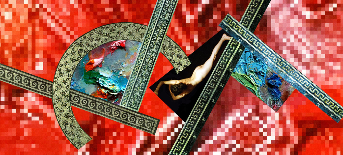 "Absturz" Titel des Bodenbilds, digitale und analoge Malerei, Mosaikzitate und Foto einer Figur.