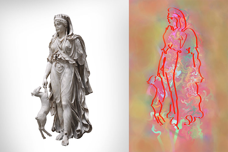 Venus, Artemis und die Amazone inszenieren femininen Charakter durch die Beziehung von Nacktheit und Kleidung, dem Zeigen und Verschleiern des Körpers. Das Sehen wird provoziert und behindert. Dieses erotische Versteckspiel reizt und verzögert die Wahrnehmung.